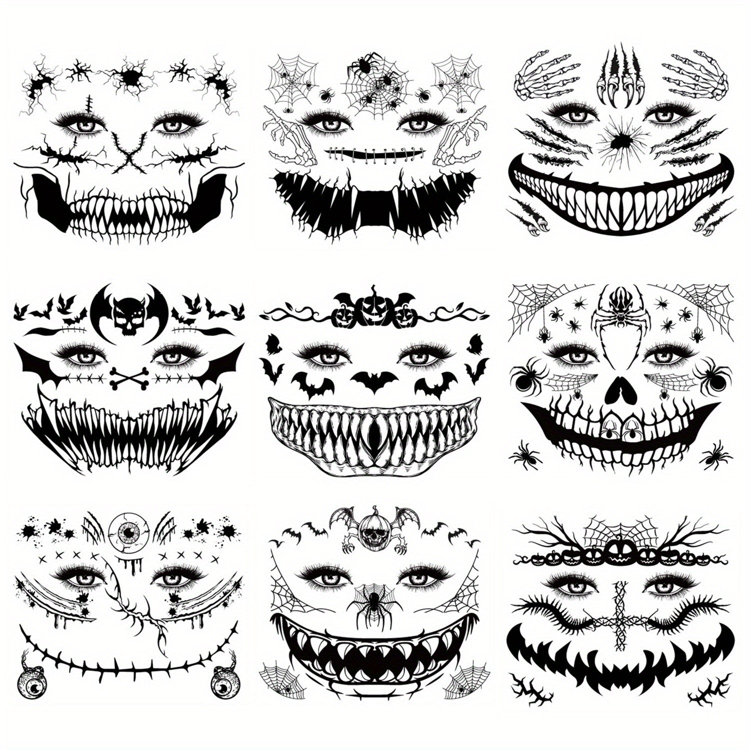 Black Skull Skeleton Face Temporary Tattoos - 9 Sheets Waterproof Halloween Stickers